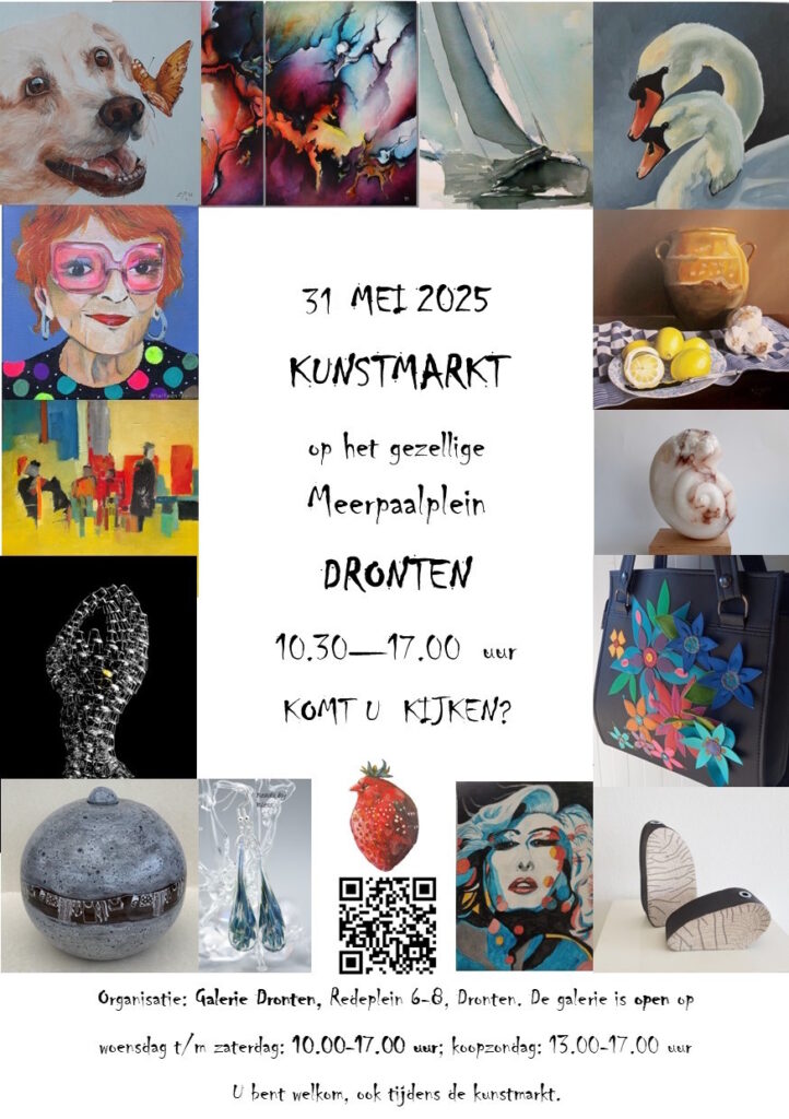 Het Meerpaalplein in Dronten wordt op zaterdag 31 mei 2025 van 10.30 tot 17.00 uur omgetoverd tot een gezellige kunstmarkt. Het publiek kan ongedwongen langs de kramen slenteren waar kunstenaars hun werk laten zien en voor verkoop aanbieden.